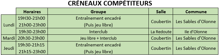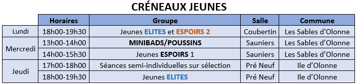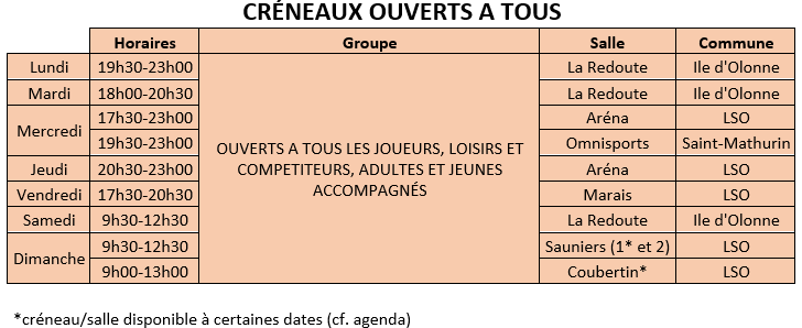 Des modifications ou des annulations de créneaux peuvent avoir lieu pendant la saison pour différentes raisons. Les informations seront communiquées via nos différents réseaux.